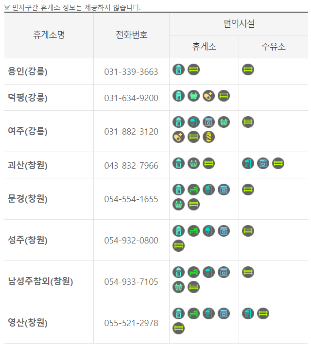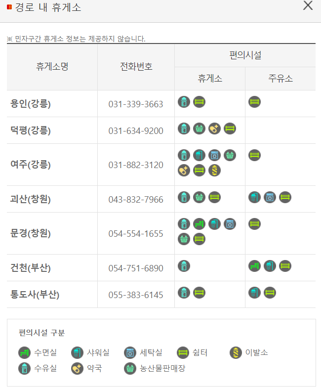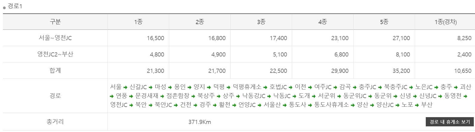구간1의 경로 내 휴게소를 살펴보니 용인 덕평 여주 괴산 문경 건천 통도사 휴게소를 이용할 수 있다는 것을 확인할 수가 있습니다.