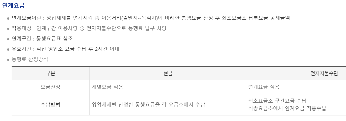 마지막으로 연계요금이라는 것을 알아두시면 좋을 것 같습니다. 연계요금이란 말그대로 요금을 연계하는 것을 말하게 되는데 본인이 운전한 모든 총 이용거리에 비례해서 통행요금을 계산하게 되고 그 후, 가장 최초의 요금소에서 납부를 한 통행료를 공제한 금액을 말하게 됩니다.
