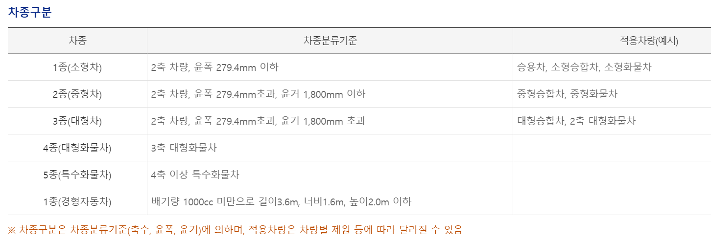 본인이 운전하는 차량의 차종을 모르시는 분들은 아래 표를 참고하여 통행료 계산을 하시면 되겠습니다.