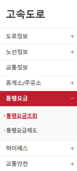 우선 공식 홈페이지로 접속해주시면 되겠습니다. 한국도로공사 홈페이지로 들어가게 되면 아래이미지처럼 고속도로 메뉴에서 통행요금 메뉴로 진입해 줍니다.