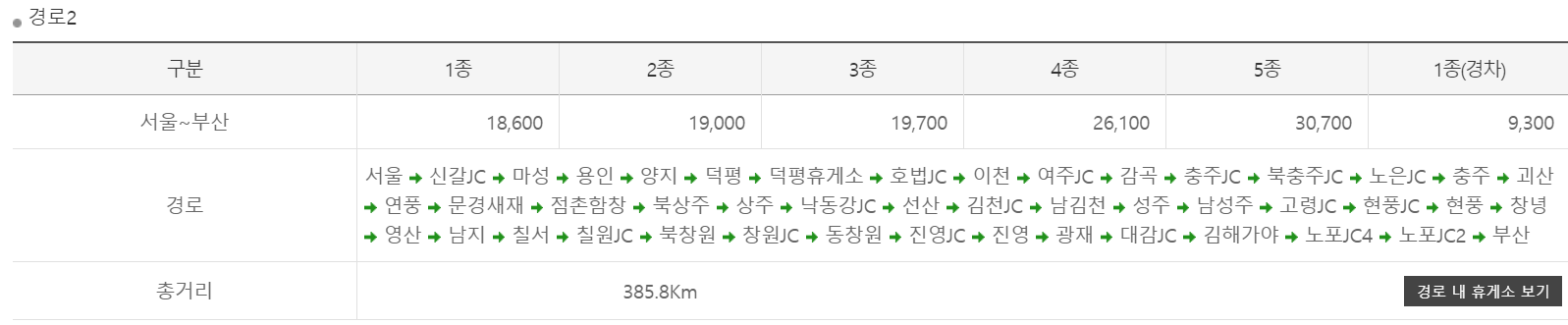 경로가 1과 2로 두 경로가 나오게 되는데 1종부터 5종 그리고 경차까지의 각 고속도로 통행료가 나오게 됩니다. 오른쪽 아래는 경로 중간에 있는 휴게소가 어디어디가 있는 지 확인도 가능합니다.
