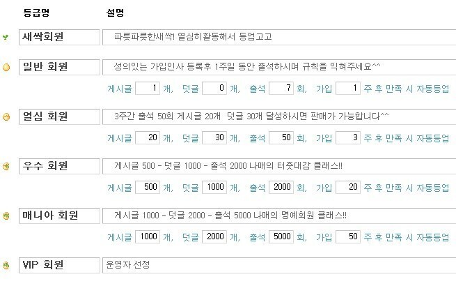 ; 본 카페의 회원 등급은 새싹 회원/일반 회원/우수 회원/매니아 회원/VIP 회원으로 나누어지며 등급별 권한이 다릅니다.