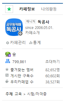 독공사카페는 약 80만명의 카페 회원수를 보유한 대형 교육 카페입니다. 독공사란 독하게 공무원을 준비하는 사람들의 모임을 말하며 네이버 대표카페로 선정된 공식 인기 카페입니다. 군무원, 9급 공무원, 7급공무원, 소방 공무원, 경찰공무원 카페 랭킹에서 1위를 했던 카페로서 공무원이 되고 싶은 분들은 카페에서 많은 교육 정보를 얻을 수 있습니다.