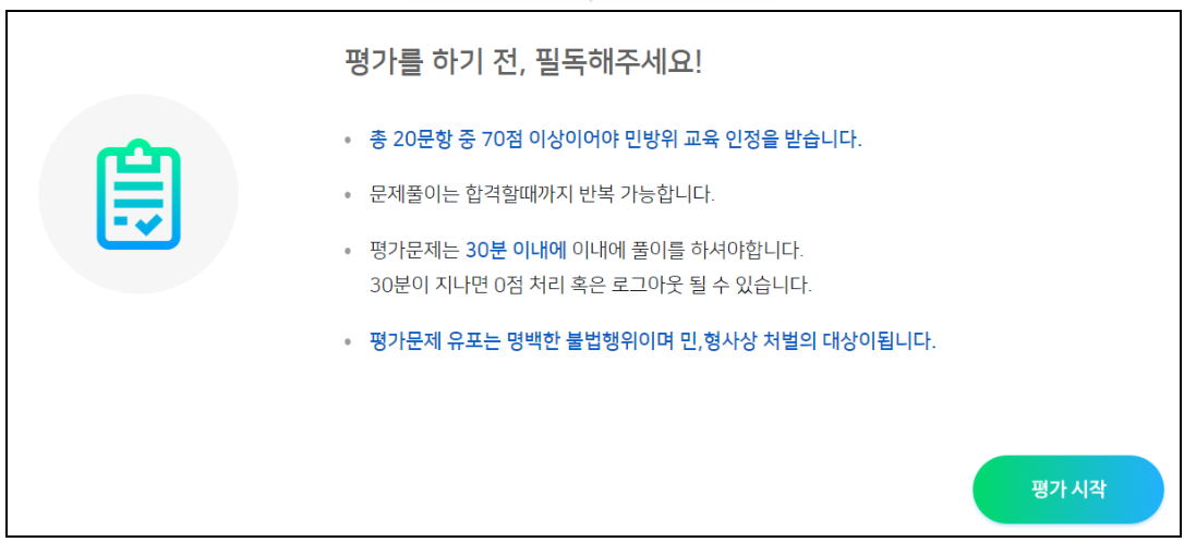 수강이 끝나면 평가를 시작해야합니다. 문제는 맞을 때 까지 반복이 가능합니다. 30분의 시간제한은 있습니다. 그리고 평가 문제의 유포는 불법이라고 나와있습니다.