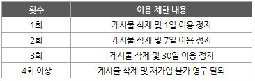 1) 1, 2의 사항을 위반하는 경우 아래와 같이 횟수에 따른 이용 제한이 진행될 수 있습니다.