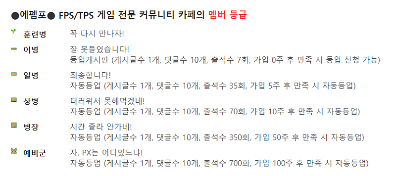 1) 에펨포 등업은 다음과 같이 각 계급의 등업기준이 충족되면 자동 등업된다.