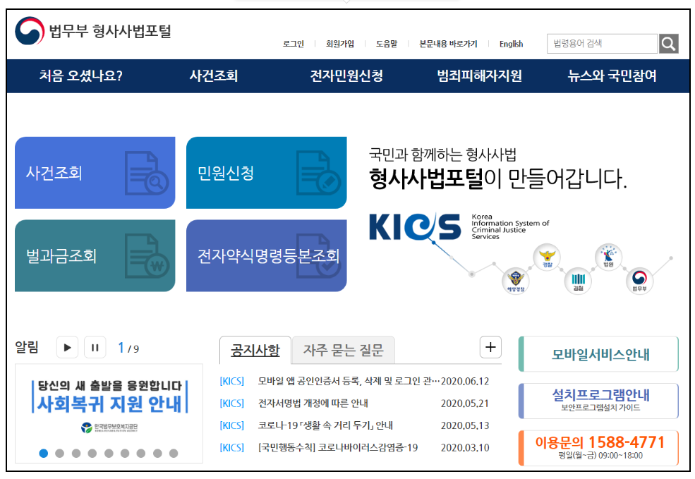법무부의 사이트 중 하나인 형사사법포털에서는 각종 벌과금조회와 민원신청 그리고 사건조회 등도 조회를 해볼 수가 있는데요. 음주운전의 경우라면 미납벌과금 조회의 메뉴로 들어가주시면 확인을 하실 수가 있습니다. 최근 홈페이지가 개편이 되면서 인터페이스가 더 깔끔해진 것을 확인할 수가 있네요. 물론 24시간 온라인으로 조회가 가능합니다.