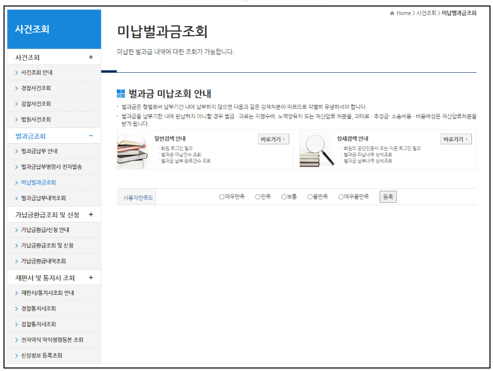 벌과금 조회로 접속을 하신 뒤 미납벌과금조회 메뉴로 접속을 해주게 되면 아래와같이 벌과금 미납조회 검색을 할 수가 있는 창이 뜨게 됩니다.