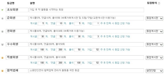 정회원 - 게시물 30개, 댓글 50개, 출석 30회, 가입 3주 후 등업조건 만족시 등업 신청 가능