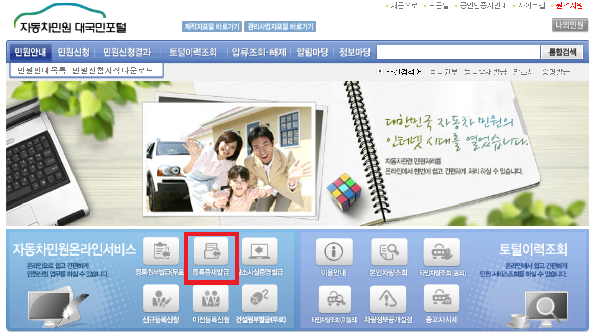 자동차 365홈페이지로 접속해도 자동차등록증을 발급받을 수가 있습니다. 홈페이지로 접속한 뒤 자동차 민원 대국민포털로 진입을 하게 되면 등록증재발급이라는 메뉴가 홈페이지 메인화면에 나오게 됩니다.