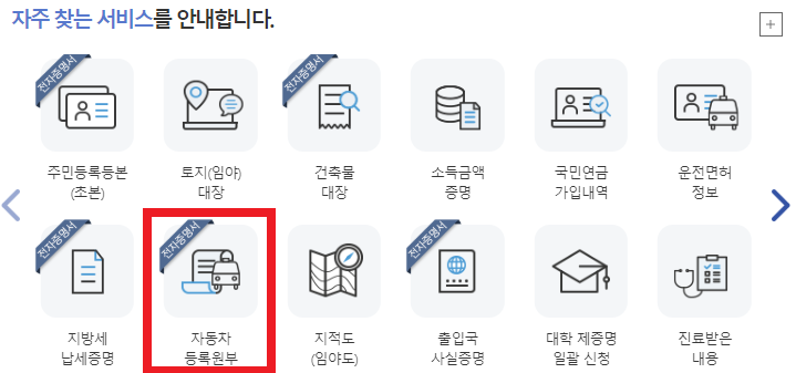 발급 받는 방법은 상당히 간단합니다. 민원24 홈페이지로 접속해주시면 되겠습니다. 접속한 뒤, 자주찾는 서비스에서 자동차 등록원부를 눌러서 민원 신청을 해주시면 되겠습니다.