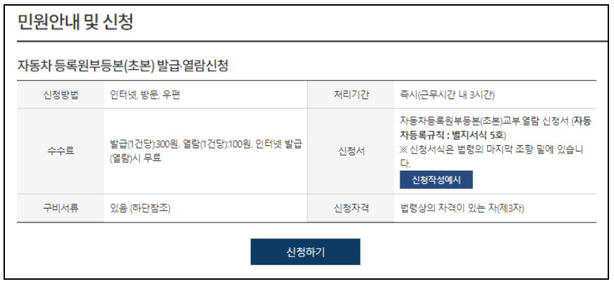 민원 안내 신청에서 신청하기 버튼을 눌러서 기본 적인 정보와 공인인증서를 통해 로그인을 해주시면 인터넷 발급이 완료가 됩니다.