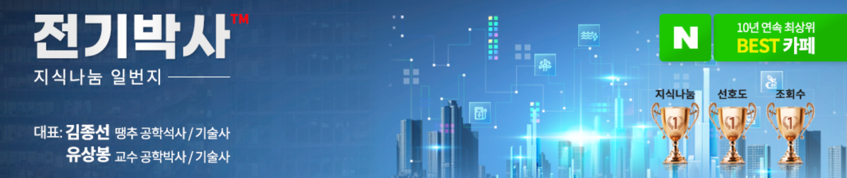 약 45만 명의 회원을 보유한 네이버 카페 "전기박사"입니다. 김종산 공학석사, 유상복 공학박사 대표님들이 운영하는 카페로 10년 연속 최상위 네이버 베스트 카페에 선정되기도 하였습니다. 전기와 관련된 모든 정보를 얻을 수 있고 공유할 수 있는 카페입니다. 각종 기술사, 기능사, 기사 등의 교육 내용부터 실무 및 유통까지 엄청나게 많은 지식들이 쌓여있는 공간입니다.