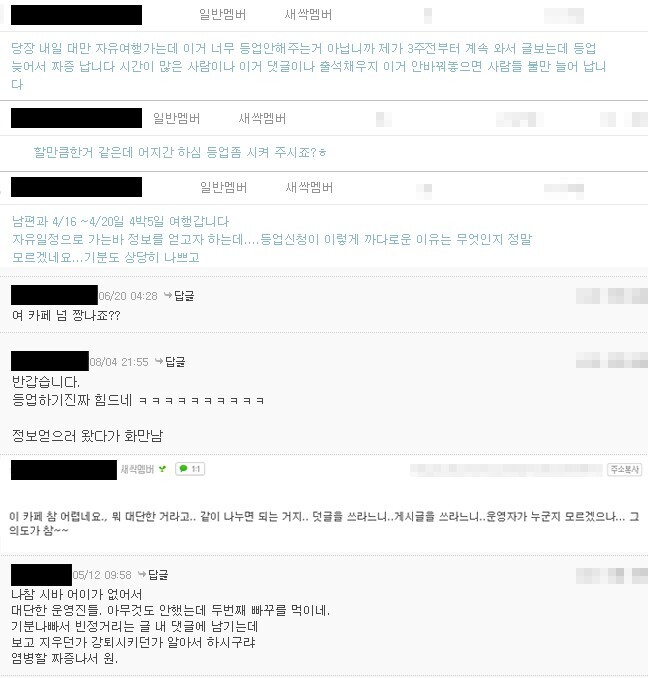 5. 등업후 이용가능한 <여행Q&A><함께해요><벼룩시장>게시판에 올려야하는 내용을 가입인사에 작성한 경우