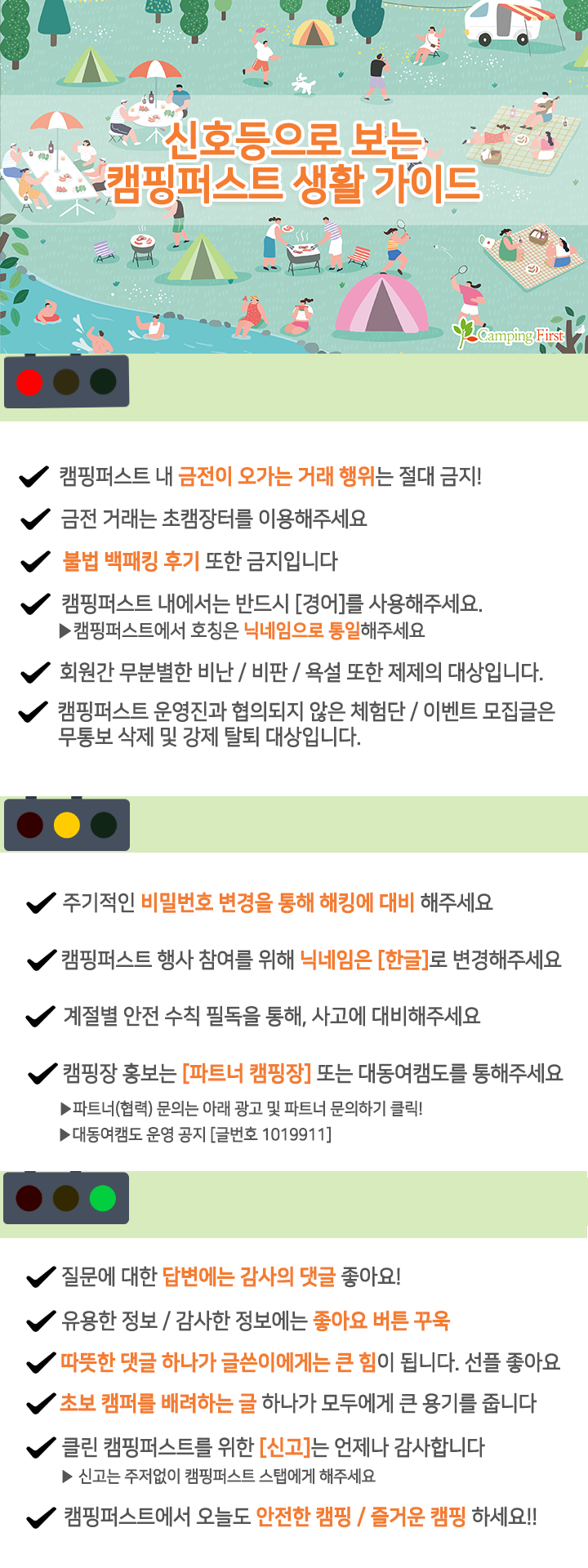 2. 초캠장터는 캠핑퍼스트와 별개로 이루어지며, 장터의 문제(장터강퇴, 운영방식이견게재)를 캠핑퍼스트 사이트에 옮기는 것을 금지 한다.