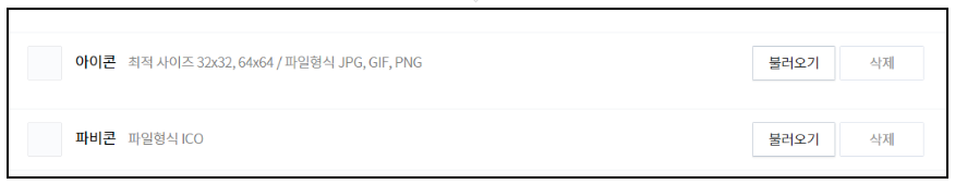 아이콘과 파비콘을 넣을 수 있는 설정창이 있습니다. 아이콘은 아까 다운로드 받은 폴더에서 32x32 사이즈를 골라서 넣어주시고 파비콘은. ico의 확장명을 가지고 있는 파일을 넣어주신 뒤 '변경사항 저장'을 눌러서 완료해주시면 되겠습니다.