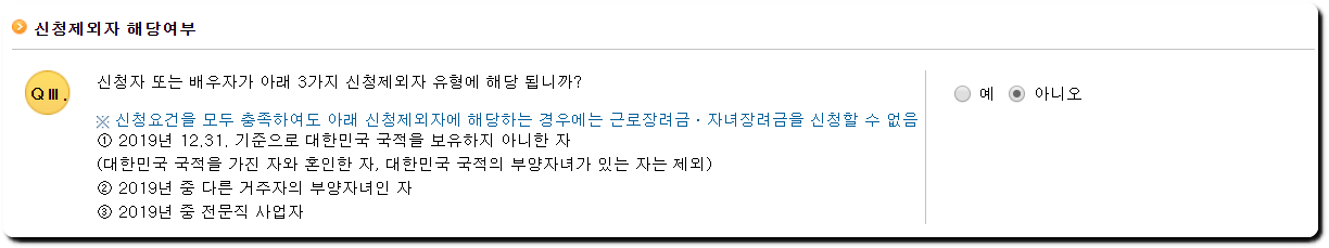 *또한 2019년 12월 31일 기준 기준 배우자가 있거나 2001.1.2.~2019.12.31. 출생한 18세 미만(중증장애인은 연령제한 없음)의 부양자녀가 있거나, 주민등록표상 동거하는 70세 이상(1949.12.31 이전 출생) 직계존속 있어야하고, 입양된 부양자녀도 가능합니다.