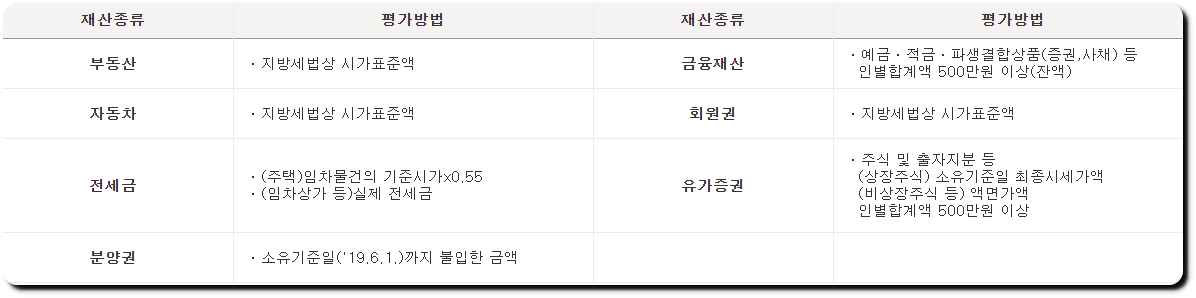 재산 평가 방법은 아래와 같습니다.