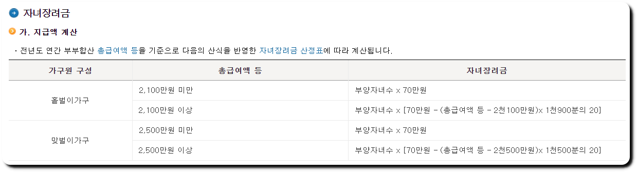 자녀장려금 지급액 계산 방법