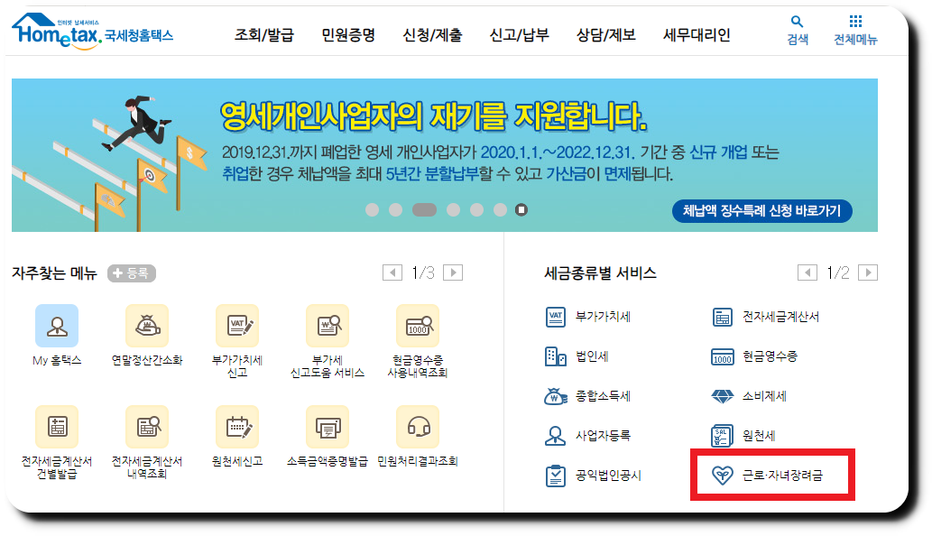 국세청홈택스로 접속을 하게 되면 오른쪽 하단에 근로자녀장려금이 보이시면 눌러줍니다.