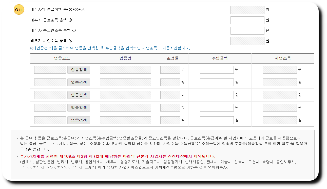 *주의사항은 변호사나 공인회계사 그리고 의사와 같은 전문직으로서의 사업소득이 있는 사람(배우자 포함)은 신청 지급 대상에 해당 되지 않습니다.