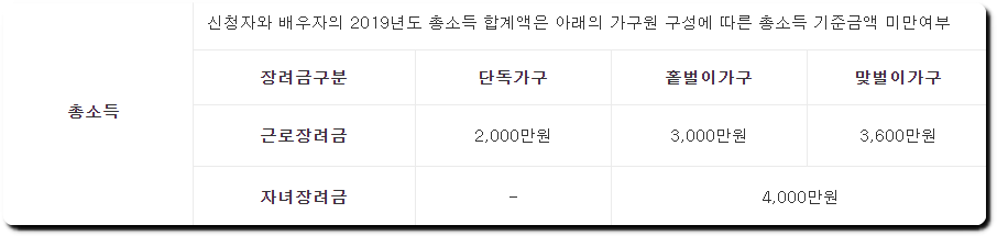정기 근로장려금 자녀장려금 자격요건 [소득]