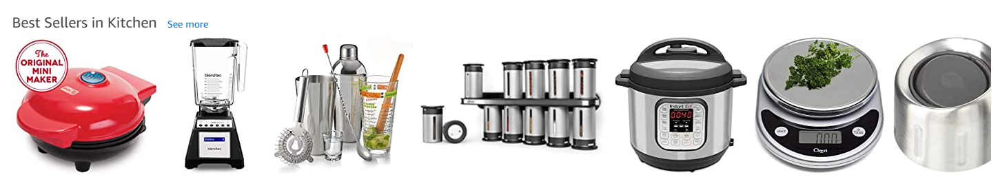 아마존닷컴에 접속하게 되면 메인화면에 아래 이미지처럼 인기있는 카테고리가 우선적으로 메인에 걸리게 된다. 첫 번 째 트랜드 아이템은 주방용품이다. 메인페이지에서는 우선 주방의 베스트셀러가 나오게 되는데, 우리에게 익숙치 않은 모양의 기계들이라 무엇인지 알 수 없을 수 있으나 상품을 일일이 눌러보면 이름을 확인할 수가 있다.